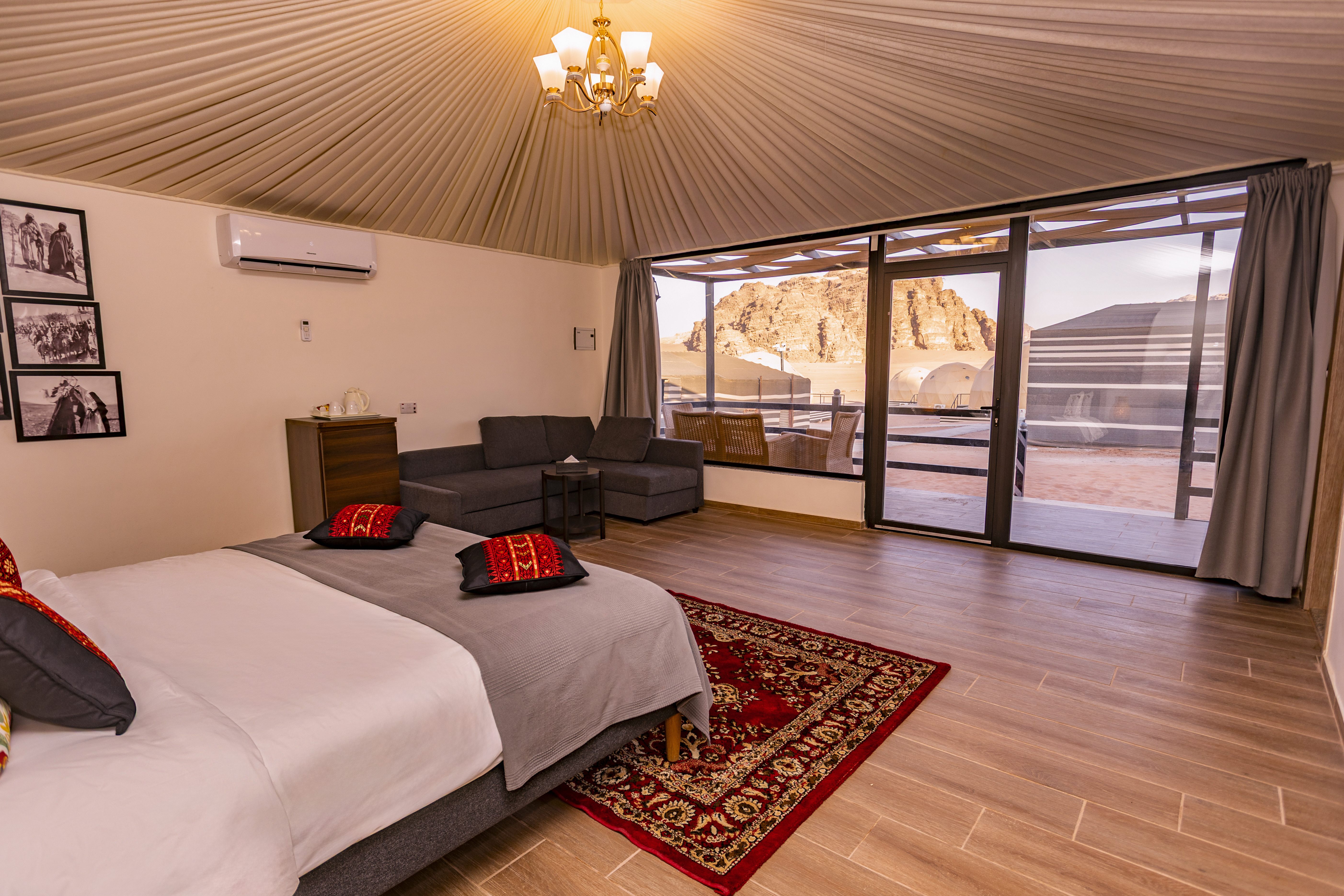 Our most spacious single-room retreat, the Grand Tent offers an immersive desert experience with floor-to-ceiling windows that frame Wadi Rum’s vast landscape. An indoor seating area provides a peaceful space to unwind, balancing comfort and simplicity. Designed for those who appreciate tranquility, this tent invites you to slow down and embrace the desert’s rhythm.